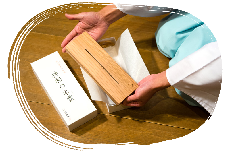 そのような中、ご神域で育まれた「神杉」を使い、現代の住環境に馴染む「かみだな」のとして「御神札まつり箱」を奉製いたしました。