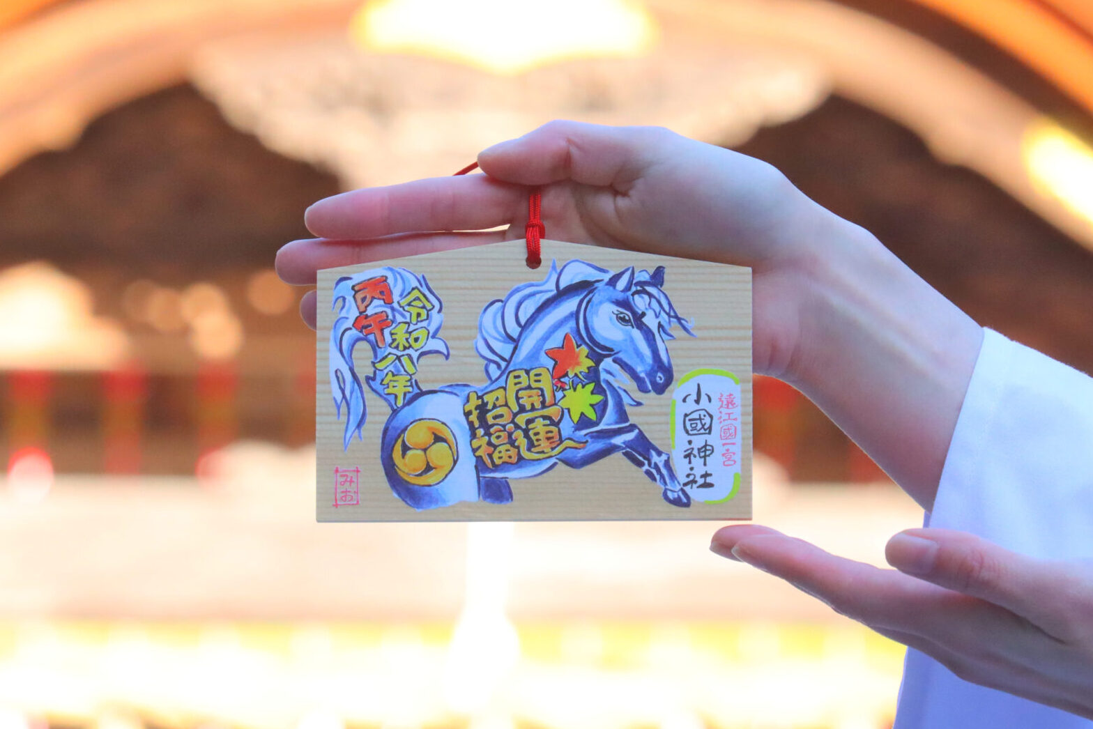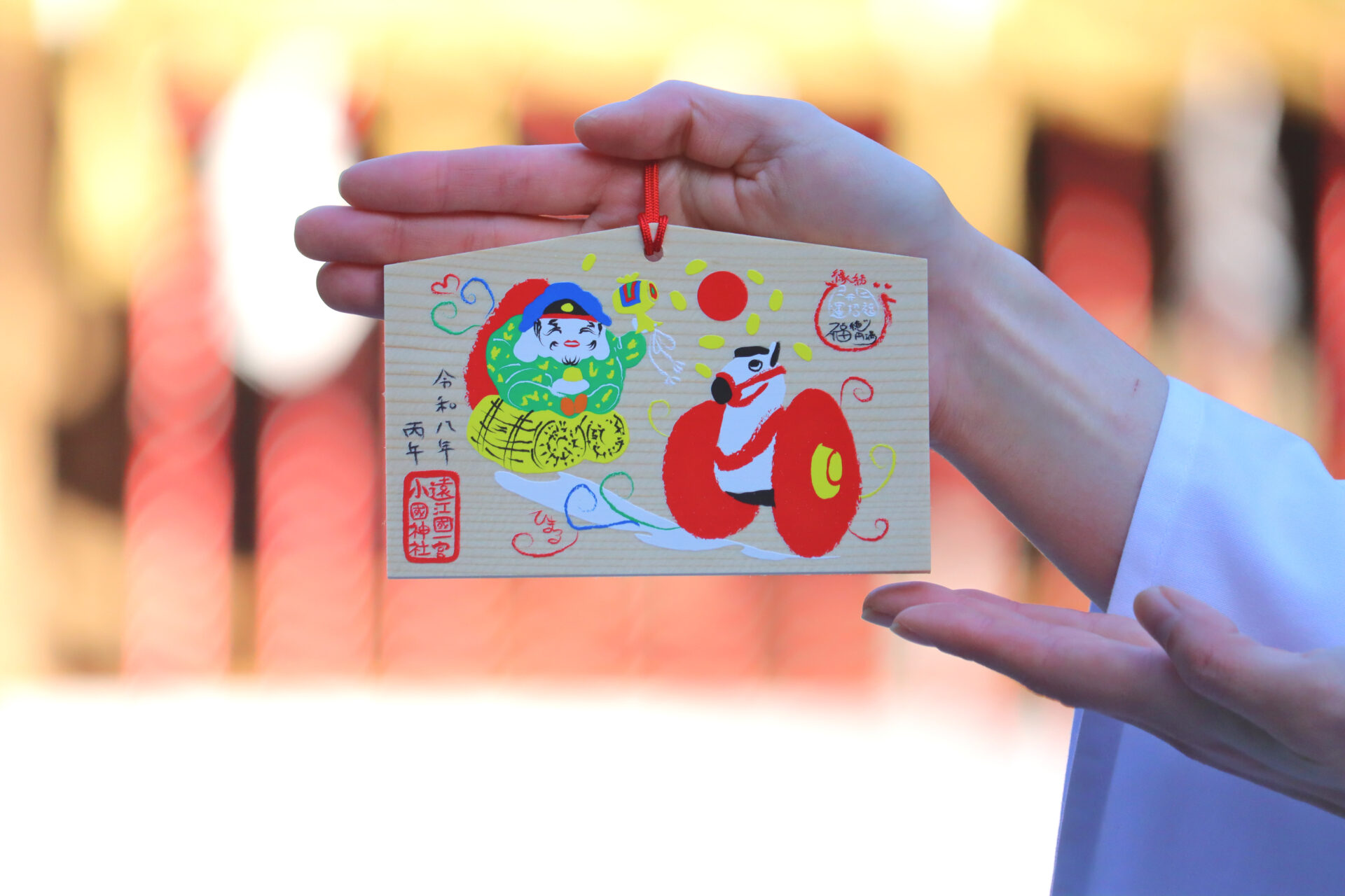 令和8年の干支絵馬のひとつは、当社の崇敬者で日本唯一の「絵馬師」として活躍する永崎ひまるさんによる、小國神社だけの特別な作品です。