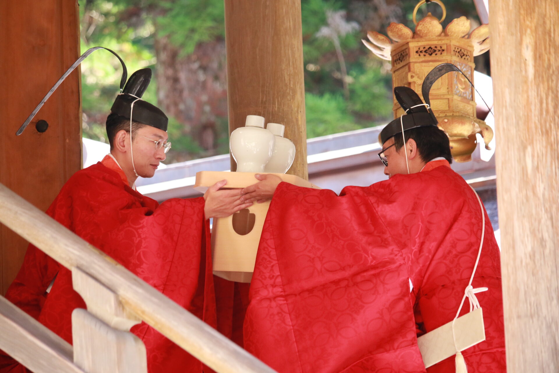 宮中において、神武天皇建国以来、歴代天皇の中でも特に大切にされ、天皇陛下がその年に収穫された稲などの食物をお供えし、天照大御神をはじめ、八百万の神々に捧げ、自らも共に召し上がり、ご神恩に感謝されます。(神人共食)