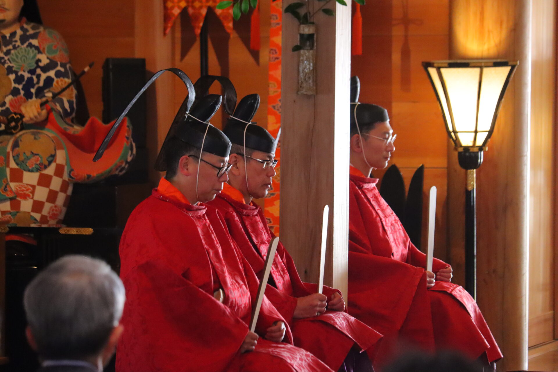 | 4月18日(土) | 例祭(10時)・古式十二段舞楽試楽(14時より舞殿にて) 小國神社にとって最も重要な祭典である「例祭」は、本宮山に御神霊が出現した日に由来し、国家の安寧と地域の繁栄を祈ります。 また、「試楽」では翌日の奉奏に向けた十二段舞楽が奉納されます。 |