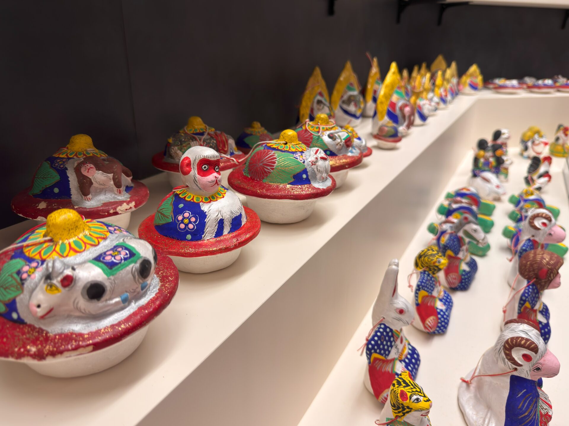 館内で展示の土鈴は、当社が所蔵する13300余点の中から厳選した約900点です。北は北海道から南は沖縄まで、また海外で制作されたものも含まれます。干支をかたどったもの、各地の祭事や風俗を表現したもの、神話や伝説に登場する神々や動物をモチーフにしたもの、大正・昭和時代のレトロ商品など、多種多様な土鈴があります。個性豊かな造形や、美しい絵付けなど、細部にわたる職人の手仕事を間近でご覧いただけます。