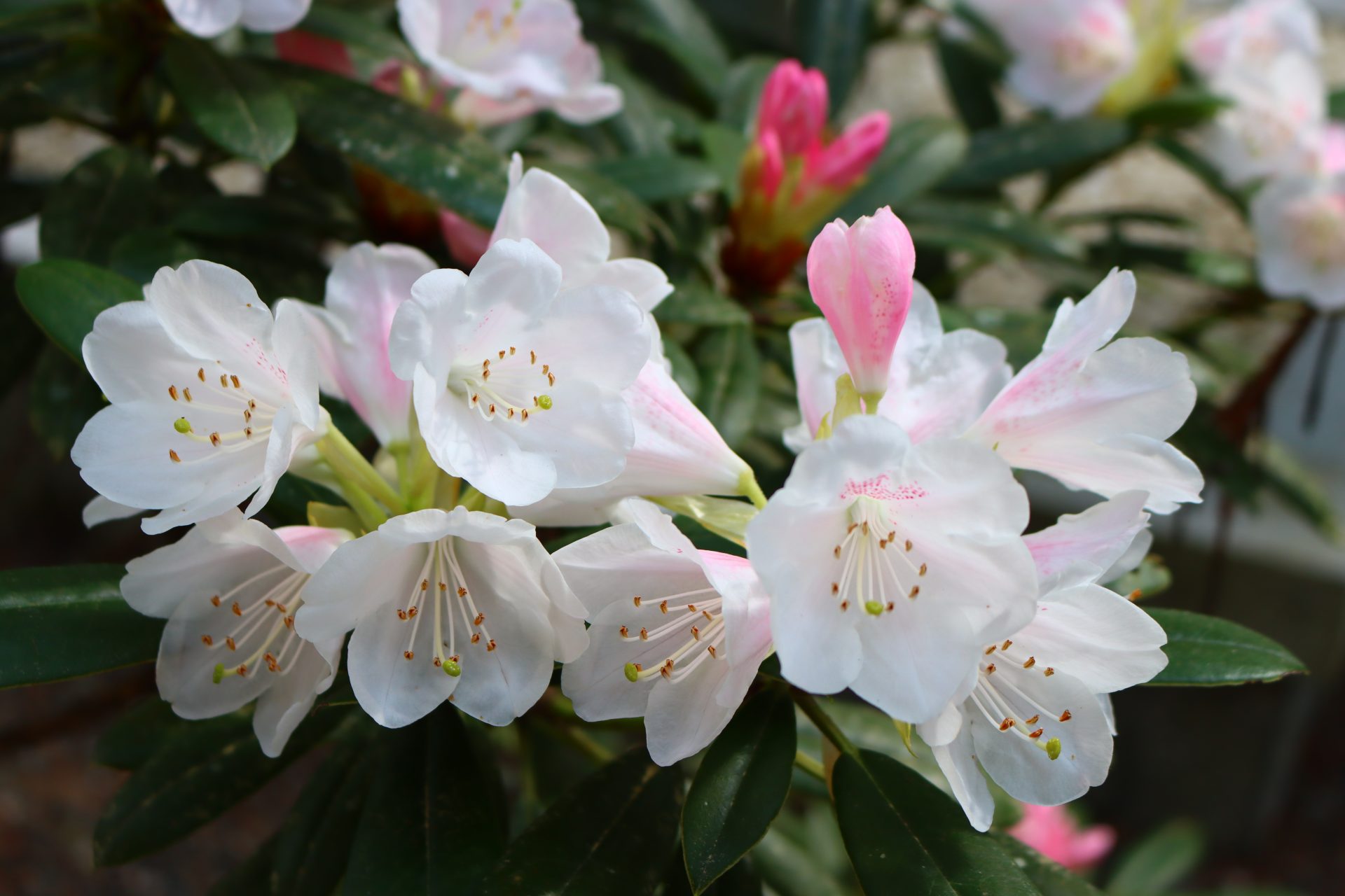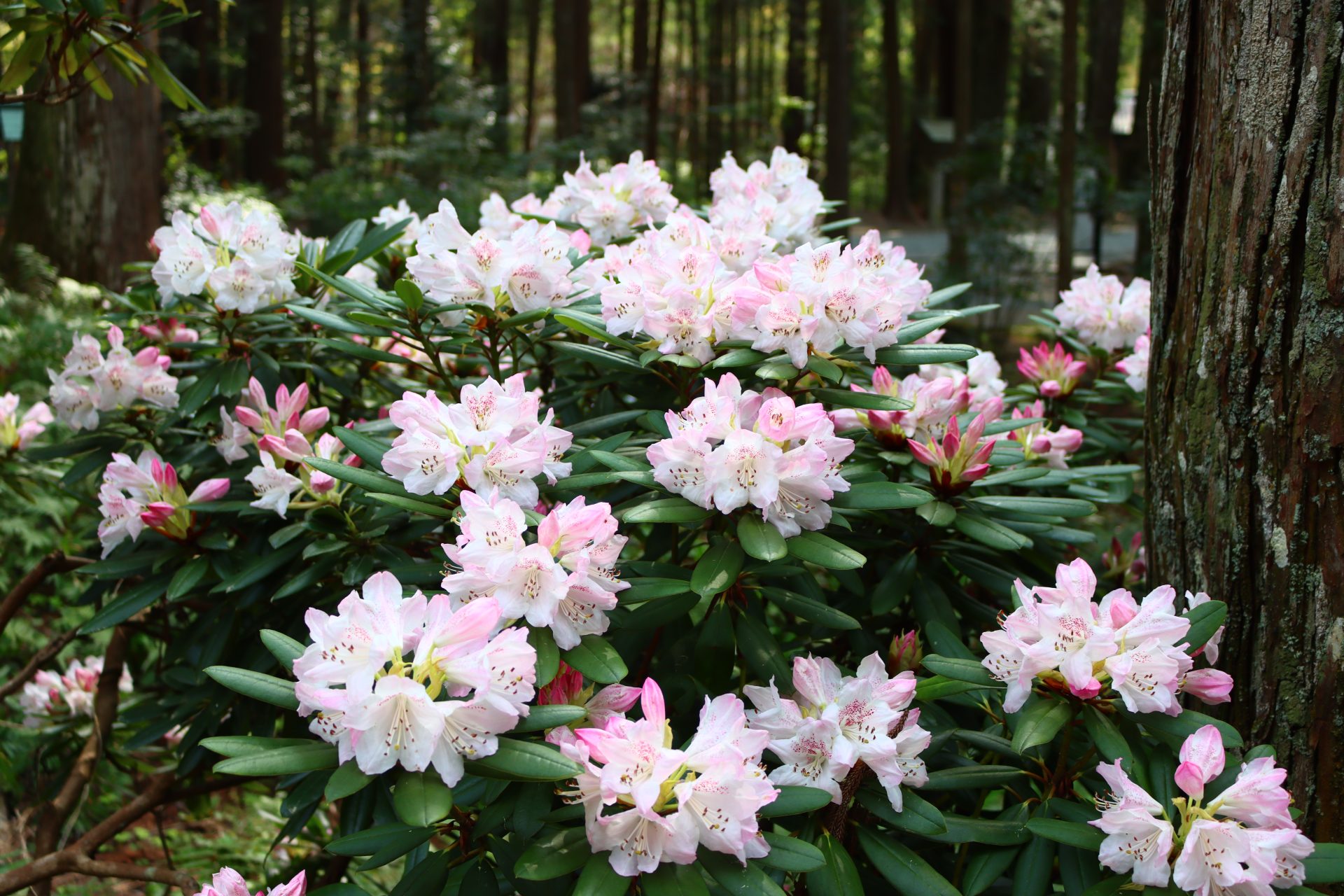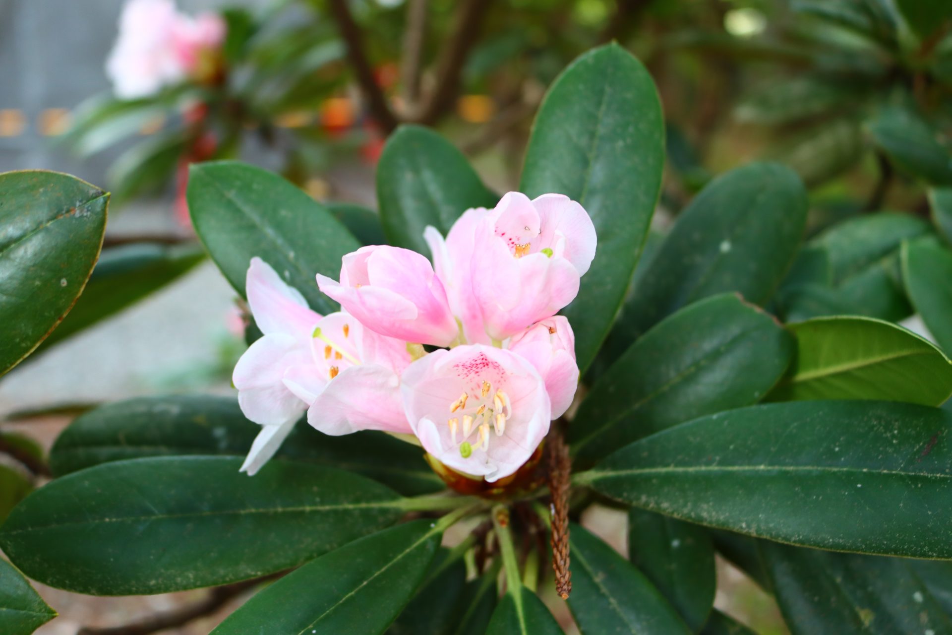 令和7年 癒しの斎庭にシャクナゲが咲き始めています。~境内に咲く春の山野草~