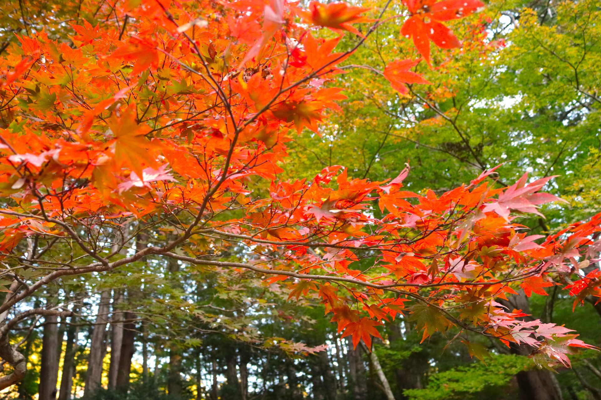 小國神社の紅葉は、最低気温が10度を下回る日が数日続きますと色づきが進み、寒暖差が大きいほど色づきが鮮やかになるといわれています。